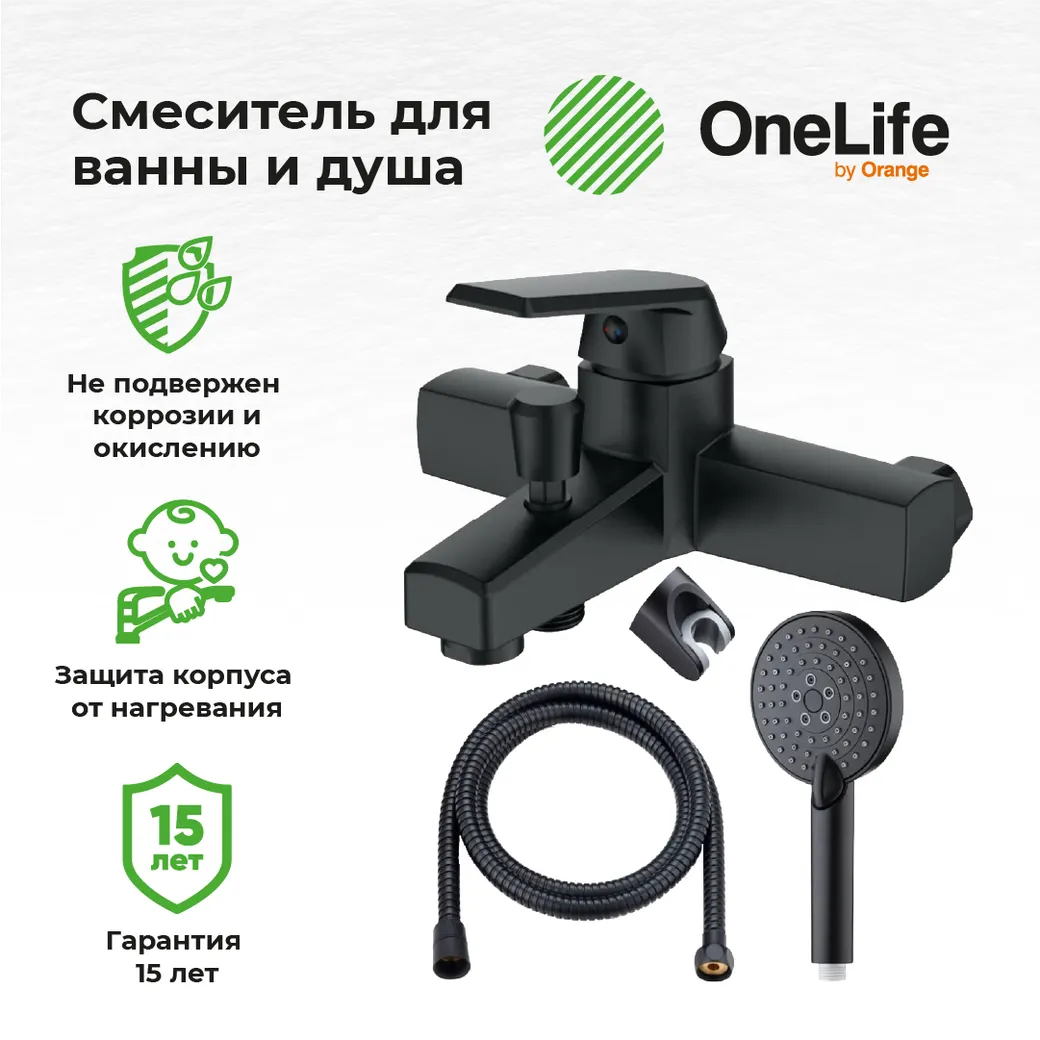 Однозахватный полимерный смеситель для ванны/душа с фиксированным изливом и душевым набором OneLife гармонично дополнит интерьер ванной комнаты в современном или традиционном стиле. Фирменный картридж Orange обеспечит легкое управление напором и температурой воды. Вместо привычного латунного сплава он изготовлен из запатентованного высокотехнологичного полимера (выдерживает 510 000 циклов и 53 АТМ без замены изделия после теста на цикличность, исключает возможность обжечься при касании, не подвержен коррозии и окислению, стойкий к отрицательным температурам), что обеспечивает срок службы более 15 лет. Встроенный аэратор экономит воду и, обогащая струю воздухом, делает её мягкой и без брызг. Переключение между режимами душ/ванна осуществляется с помощью вытяжного дивертора. В комплекте душевой набор: ручной душ d 110 мм (3 режима струи) с силиконовыми наконечниками (защита от известкового налета RUB CLEAN), с системой AIR IN; настенный держатель ручного душа с регулировкой угла наклона (в шести позициях); душевой шланг 150 см в металлической оплетке, с защитой от перекручивания. Цвет матовый черный.
