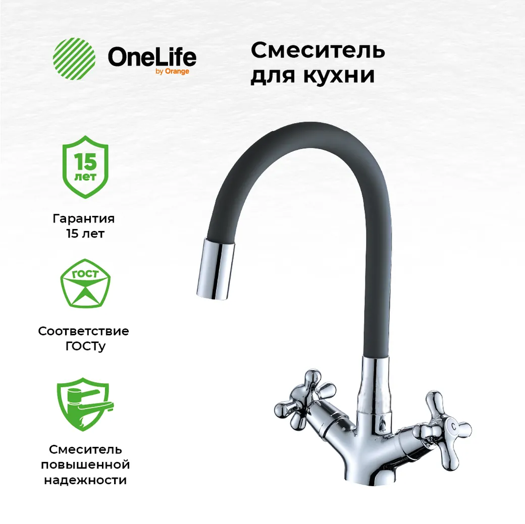 OneLife смеситель для кухни двухвентильный полимерный с гибким изливом, хром/черный арт-P03-007cr