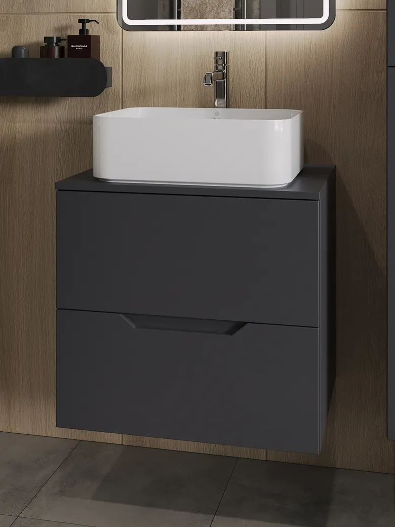 Тумба подвесная с накладной раковиной Orange Line отличается современным дизайном. Изготовлена из МДФ высокой плотности. Мебель покрыта пленкой ПВХ с технологией Soft Touch — ламинация класса премиум, с повышенными тактильными свойствами. Пленка обеспечивает дополнительную защиту мебели от влаги и перепадов температуры. На ящики установлены комплекты скрытых направляющих Hettich, обеспечивающие полное выдвижение и имеющие встроенную систему плавного и бесшумного закрывания. Исполнение - матовое. Материал раковины - фарфор. Отверстия в столешнице под раковину и смеситель монтируются самостоятельно.