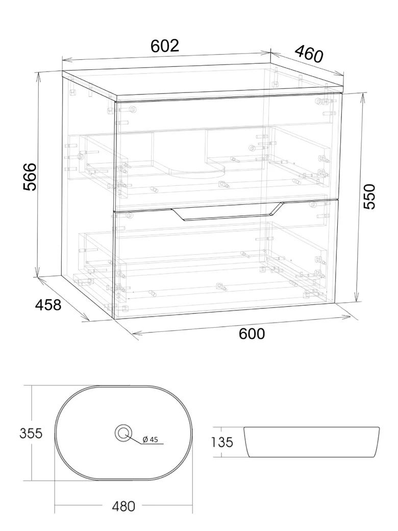 Orange Line тумба с раковиной подвесная 60 см, графит/белый арт-Li-60TugMDF+B05-480W