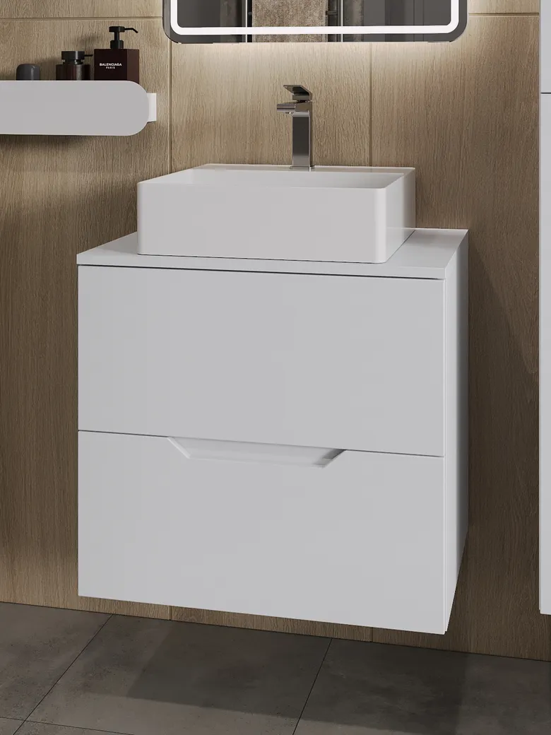 Тумба подвесная с накладной раковиной Orange Line отличается современным дизайном. Изготовлена из МДФ высокой плотности. Мебель покрыта пленкой ПВХ с технологией Soft Touch — ламинация класса премиум, с повышенными тактильными свойствами. Пленка обеспечивает дополнительную защиту мебели от влаги и перепадов температуры. На ящики установлены комплекты скрытых направляющих Hettich, обеспечивающие полное выдвижение и имеющие встроенную систему плавного и бесшумного закрывания. Исполнение - матовое. Материал раковины - фарфор. Отверстия в столешнице под раковину и смеситель монтируются самостоятельно.