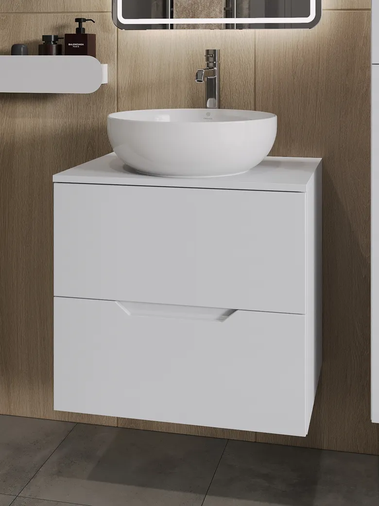 Тумба подвесная с накладной раковиной Orange Line отличается современным дизайном. Изготовлена из МДФ высокой плотности. Мебель покрыта пленкой ПВХ с технологией Soft Touch — ламинация класса премиум, с повышенными тактильными свойствами. Пленка обеспечивает дополнительную защиту мебели от влаги и перепадов температуры. На ящики установлены комплекты скрытых направляющих Hettich, обеспечивающие полное выдвижение и имеющие встроенную систему плавного и бесшумного закрывания. Исполнение - матовое. Материал раковины - фарфор. Отверстия в столешнице под раковину и смеситель монтируются самостоятельно.