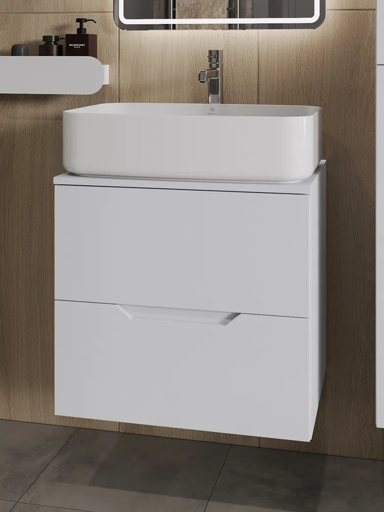 Тумба подвесная с накладной раковиной Orange Line отличается современным дизайном. Изготовлена из МДФ высокой плотности. Мебель покрыта пленкой ПВХ с технологией Soft Touch — ламинация класса премиум, с повышенными тактильными свойствами. Пленка обеспечивает дополнительную защиту мебели от влаги и перепадов температуры. На ящики установлены комплекты скрытых направляющих Hettich, обеспечивающие полное выдвижение и имеющие встроенную систему плавного и бесшумного закрывания. Исполнение - матовое. Материал раковины - фарфор. Отверстия в столешнице под раковину и смеситель монтируются самостоятельно.
