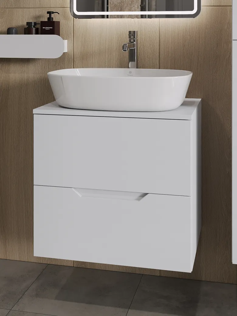 Тумба подвесная с накладной раковиной Orange Line отличается современным дизайном. Изготовлена из МДФ высокой плотности. Мебель покрыта пленкой ПВХ с технологией Soft Touch — ламинация класса премиум, с повышенными тактильными свойствами. Пленка обеспечивает дополнительную защиту мебели от влаги и перепадов температуры. На ящики установлены комплекты скрытых направляющих Hettich, обеспечивающие полное выдвижение и имеющие встроенную систему плавного и бесшумного закрывания. Исполнение - матовое. Материал раковины - фарфор. Отверстия в столешнице под раковину и смеситель монтируются самостоятельно.
