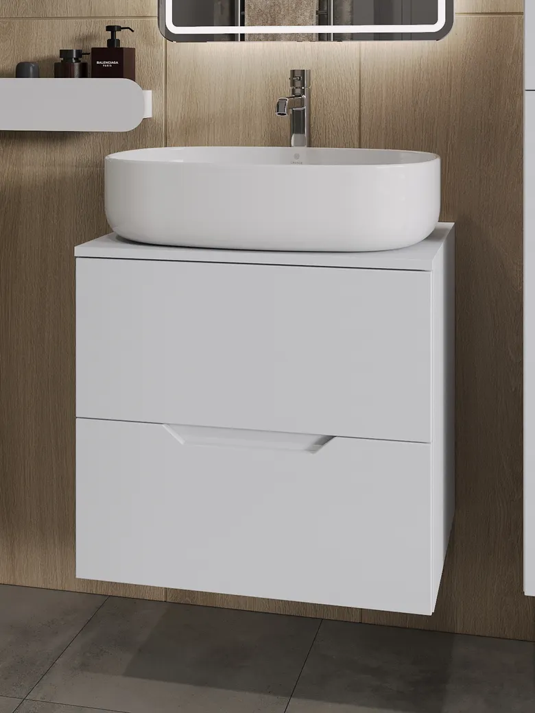 Тумба подвесная с накладной раковиной Orange Line отличается современным дизайном. Изготовлена из МДФ высокой плотности. Мебель покрыта пленкой ПВХ с технологией Soft Touch — ламинация класса премиум, с повышенными тактильными свойствами. Пленка обеспечивает дополнительную защиту мебели от влаги и перепадов температуры. На ящики установлены комплекты скрытых направляющих Hettich, обеспечивающие полное выдвижение и имеющие встроенную систему плавного и бесшумного закрывания. Исполнение - матовое. Материал раковины - фарфор. Отверстия в столешнице под раковину и смеситель монтируются самостоятельно.