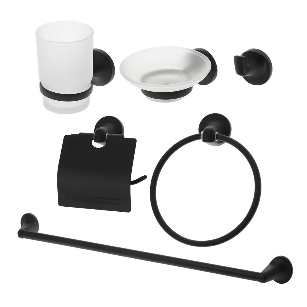 Набор аксессуаров Orange украсит интерьер ванной комнаты в едином стиле. В комплекте все необходимое: кольцо для полотенец, вешалка для полотенец, крючок, мыльница, стакан для зубных щеток, держатель для туалетной бумаги и набор креплений. Материал цинк и матовое стекло, монтаж подвесной, цвет матовый черный (нанесен методом порошковой окраски).