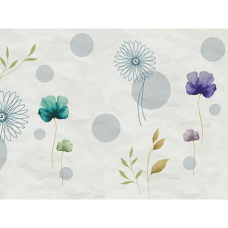 - Уникальный дизайн: рисунок с цветами, кругами и листьями в серо-зеленых и фиолетовых тонах оживит интерьер, добавив ему изысканной элегантности.