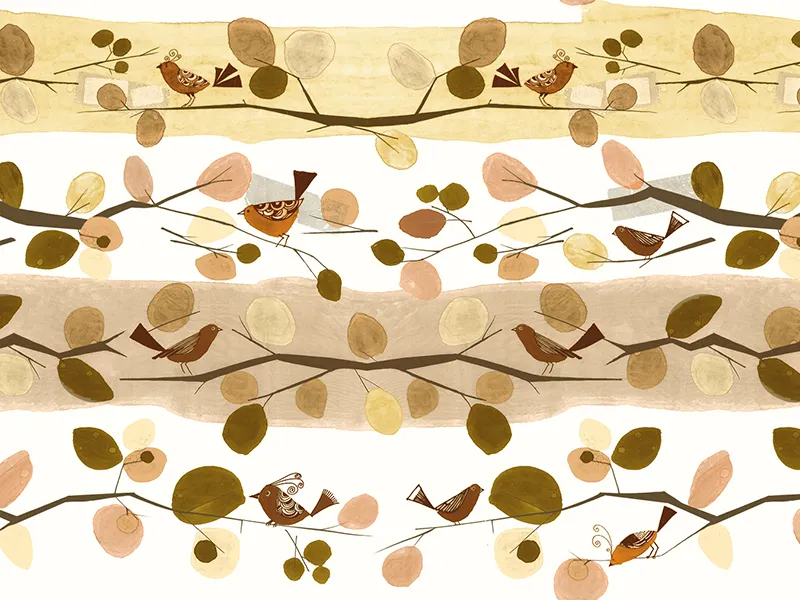 Панно Zambaiti Parati Satin Flowers IV Z66892 Винил на флизелине (3*5,1) Желтый/Бежевый/Белый/Коричневый, Листья/Птицы