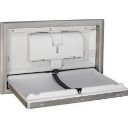 Горизонтальное устройство для смены подгузников с настенным креплением. Антибактериальный, помогает снизить риск перекрестного загрязнения. Плавное открытие и закрытие. Компактный, настенный монтаж и складной дизайн. Встроенный держатель бумаги. Предназначен для мест с высокой частотой использования. Долговечность, прочность и простота очистки. Имеет боковые прорези для подвешивания сумок на концах. Изготовлен из нержавеющей стали AISI 304 и полиэтилена высокой плотности (HDPE), атласная отделка. Максимальный поддерживаемый вес: 20 кг. Подходит для использования с младенцами и детьми до 3 лет.