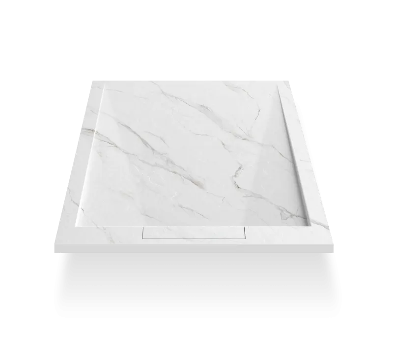 Поддон для душа прямоугольной формы. Материал: искусственный камень. Крышка слива из камня в цвет подддона. Структура поверхности: "мрамор матовый". Верхний слой поверхности: износостойкий Gel Coat. Цвет: белый мрамор.