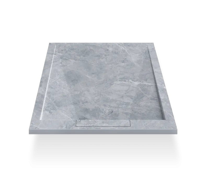 Поддон для душа прямоугольной формы. Материал: искусственный камень. Крышка слива из камня в цвет подддона. Структура поверхности: "мрамор матовый". Верхний слой поверхности: износостойкий Gel Coat. Цвет: серый мрамор.