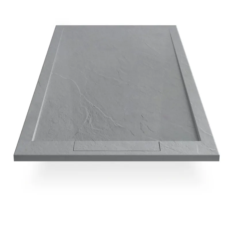 Поддон для душа прямоугольной формы. Материал: искусственный камень. Крышка слива из камня в цвет подддона. Структура поверхности: "сланец матовый". Верхний слой поверхности: износостойкий Gel Coat. Цвет: серый матовый