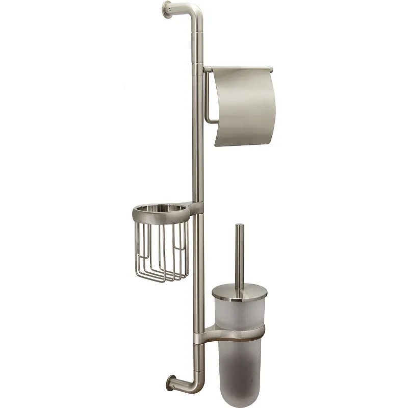 Подвесная стойка WasserKRAFT Ammer K-1448.Характеристики: Цвет: хром матовый. Материал: металл, матовое стекло. Покрытие: никель. Форма: круглая. Уплотнительные пластиковые кольца. Монтаж: настенный. Особенности: Простой и быстрый монтаж: крепление всех частей изделия осуществляется с помощью встроенных винтов и внутренней резьбы. Пластиковые уплотнители необходимы для бесшумного и плотного соединения металла. Каждое изделие в комплекте можно повернуть на 180 градусов в любую сторону, Вы можете поменять их местами или совсем убрать. Съемная колба крепится на металлическом держателе, между держателем и колбой установлена уплотнительная прокладка. В комплекте поставки: Держатель туалетной бумаги с крышкой. Держатель освежителя воздуха. Ершик для унитаза. Набор для монтажа.