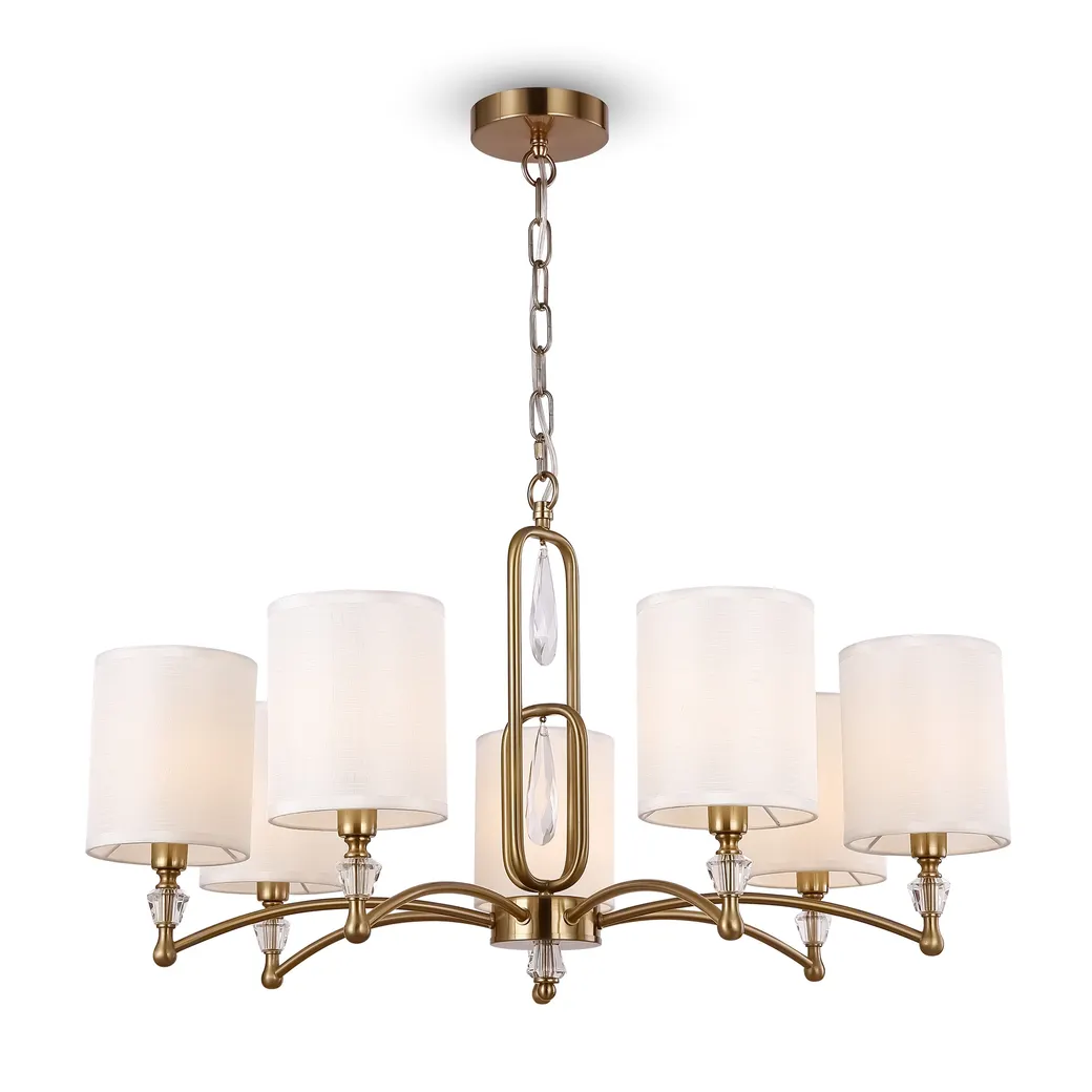 Материал арматуры – нержавеющая сталь, цвет – хром. Материал абажуров – текстиль на ПВХ, цвет – белый. Декор – прозрачное стекло. Акцентные стеклянные кристаллы на рожках со сложной огранкой.