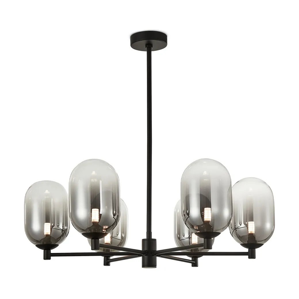 Арматура из металла матового черного цвета. Плафон из стекла с окрасом растяжка. Цвет дымчатый. Модификация — настенные, потолочные и настольные светильники. Источник света — лампа. Цоколь G9.