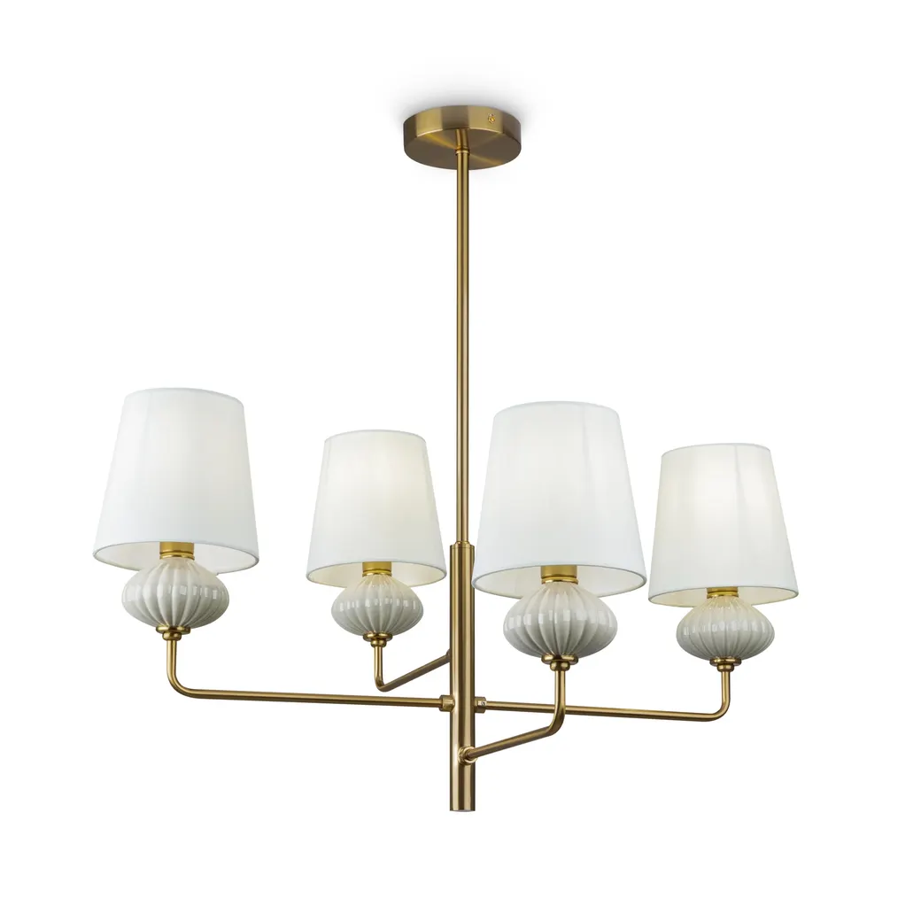 Металлическая арматура, цвет - латунь. Керамические декоративные элементы. Матовые белые абажуры. Силуэт светильника вытягивает интерьер. Источник света — лампа. Цоколь E14.