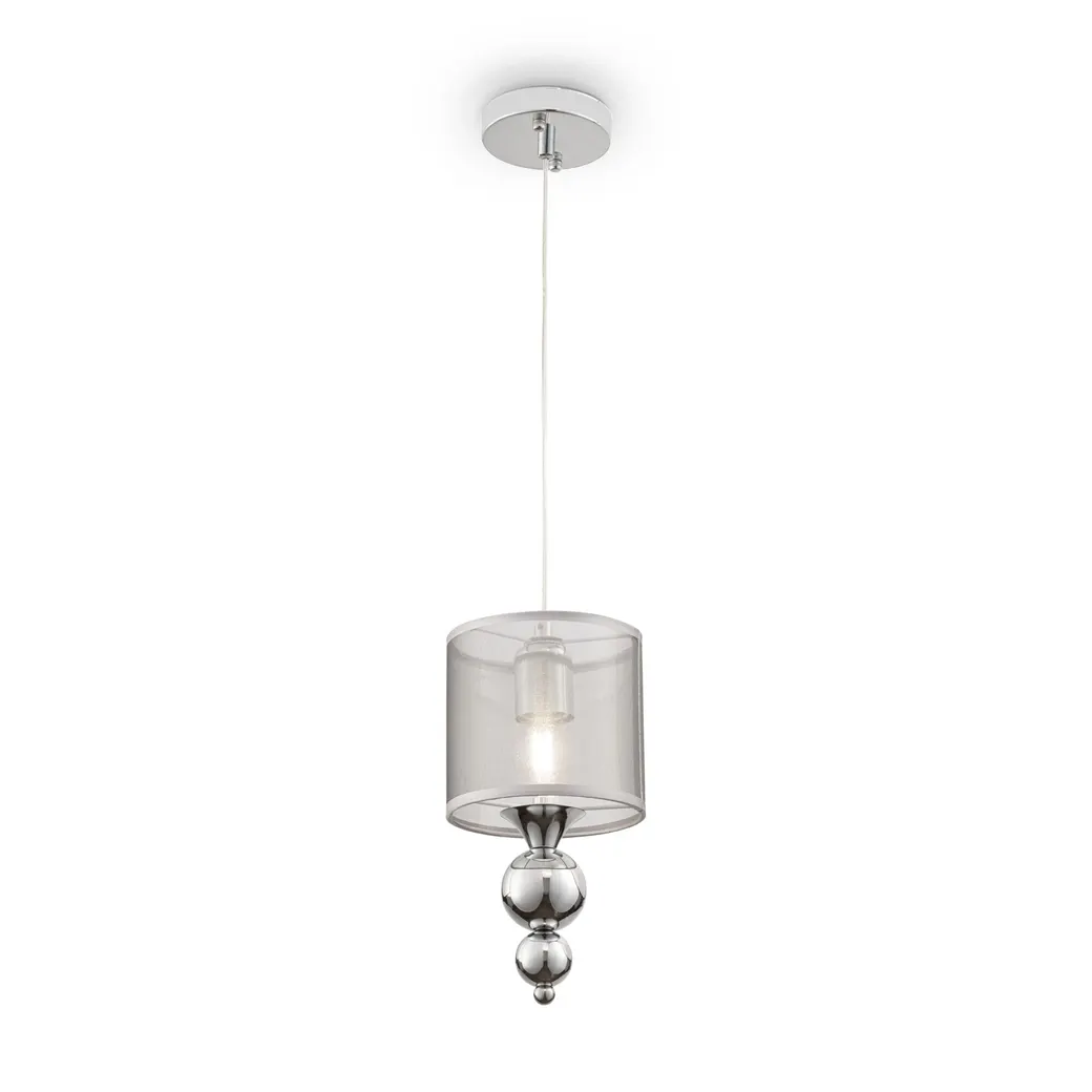 Материал арматуры – металл. Цвет – хром. Абажуры из полупрозрачной органзы серебристого оттенка. Декор – хромированные шары. Высота люстр регулируется. Одиночный подвес с цоколем Е27, лампа, бра, торшер и люстры – Е14.