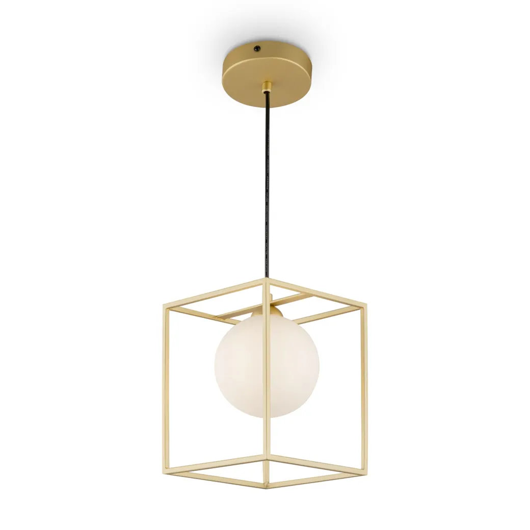 Нетривиальная игра с геометрией – сфера, заключенная в прямоугольное обрамление – яркое и весьма смелое дизайнерское решение. Стеклянные плафоны матово-белого цвета эффектно контрастируют с металлической арматурой роскошного золотого оттенка. Компактные размеры светильника позволяют использовать его даже в небольших комнатах с низкими потолками. В серии представлены люстры различной высоты на 3 и 1 плафон, а также настольная лампа. Светильник-арт-объект станет достойным украшением современных интерьеров, выполненных в различных стилевых решениях.
