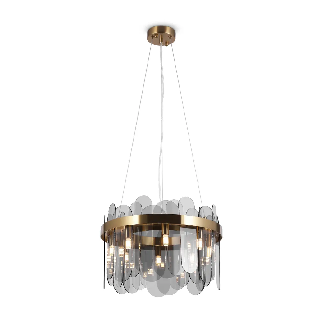Арматура из металла. Цвет – латунь и никель. Стеклянный декор в двух вариантах: фактурный с эффектом «замороженного стекла» и глянцевый дымчатого оттенка. Источник света – лампа G9.