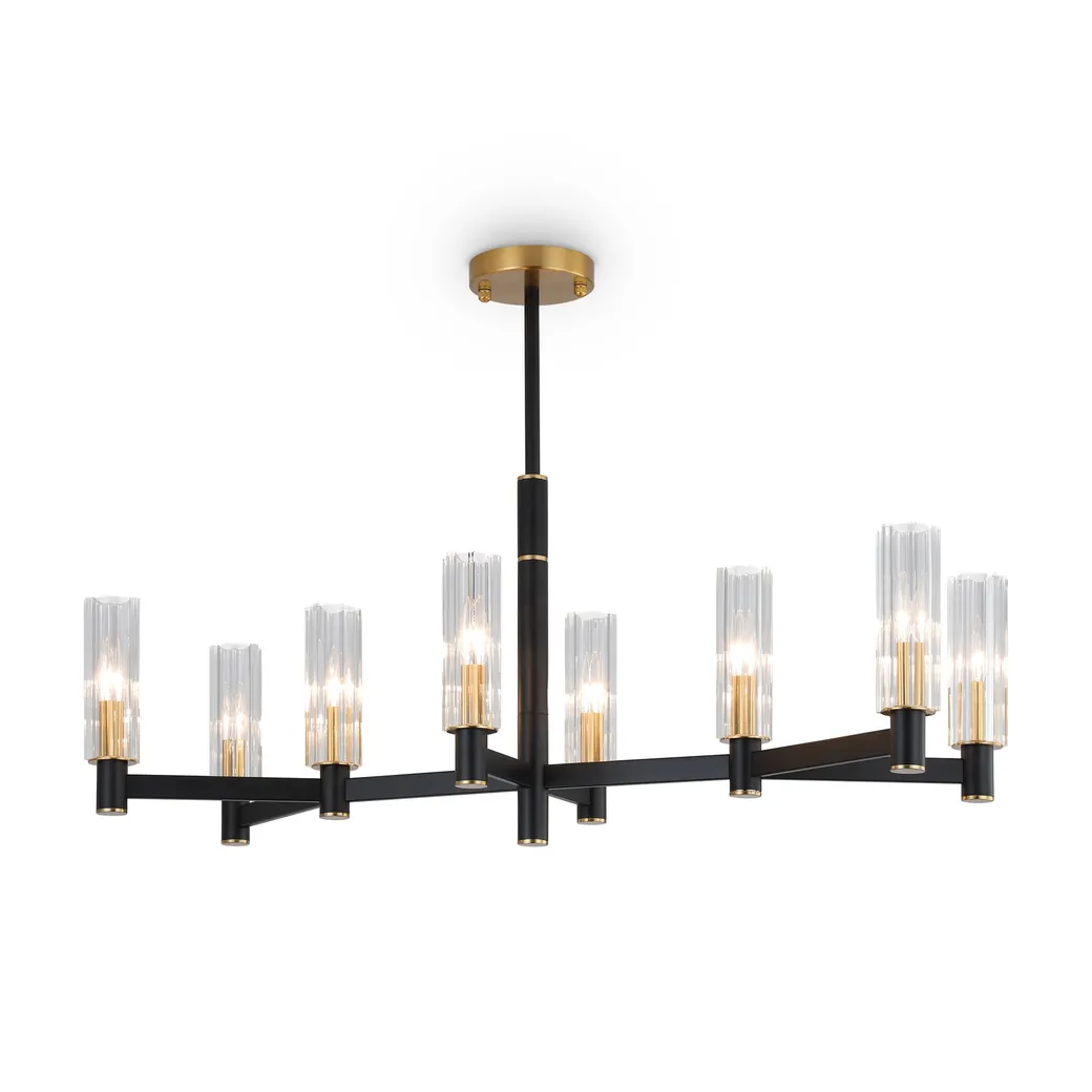 Арматура из металла сочетает два оттенка: черный и латунь. Плафоны цилиндрической формы выполнены из рельефного прозрачного стекла. Актуальная геометрия с настроением американской классики. Источник света – лампа с цоколем E14.