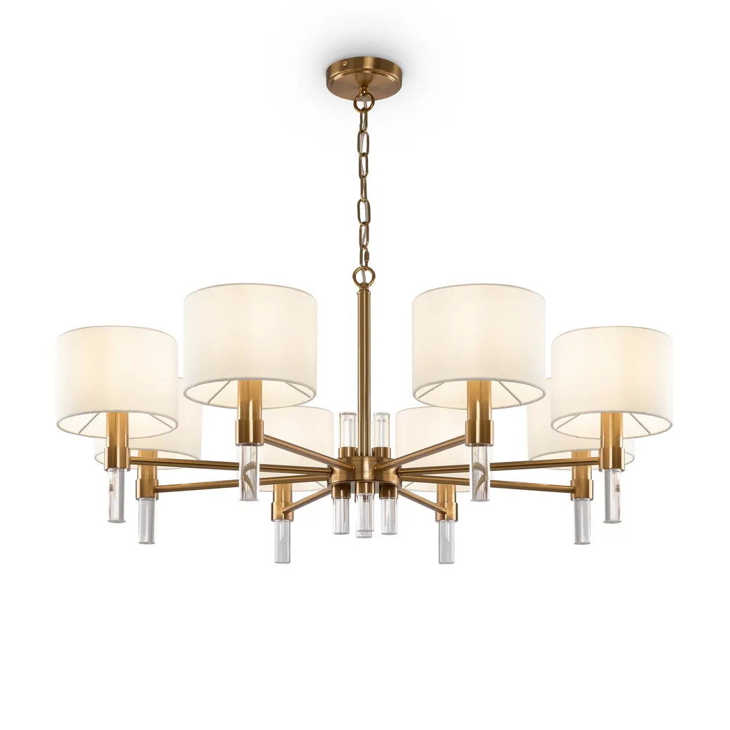 Металлическая арматура. Цвет – латунь. Тканевые абажуры белого оттенка. Декор – прозрачные акриловые трубки. Трендовая комбинация фактур и материалов. Широкий ассортимент. Торшер и подвес с цоколем Е27, лампа, бра и люстры – Е14.