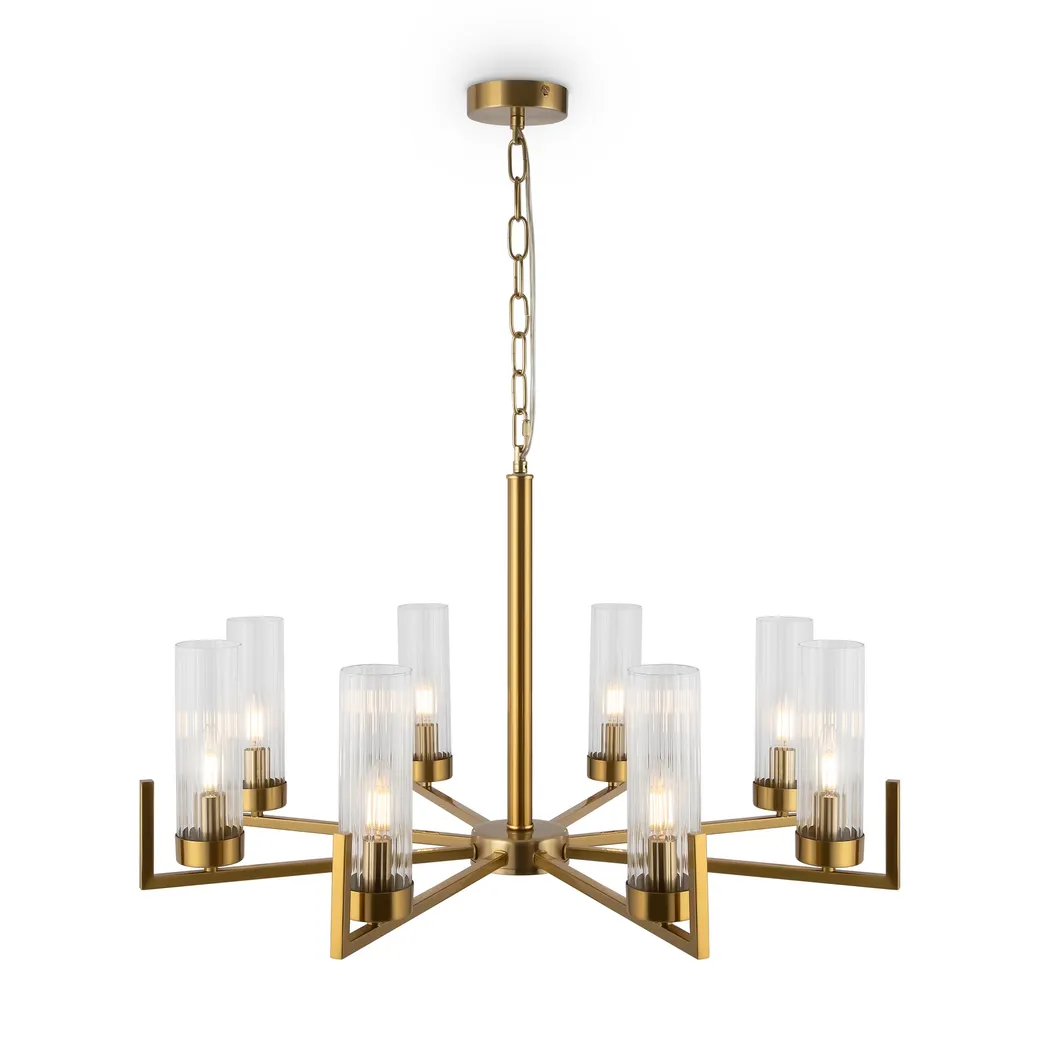 Дизайн на стыке классики и современности, выдержанная эстетика американского стиля в лаконичном исполнении. Adeline – выбор тех, кто ценит традиции. Арматура из металла представлена в оттенках хрома и латуни. Её строгий силуэт подчеркнут минималистичными плафонами-цилиндрами. Граненое стекло с ребристым рисунком – актуальный тренд, создающий модный контраст фактур. Направленные вверх источники света равномерно распределяют световой поток по комнате и визуально приподнимают потолки. В серию входят люстры на 5, 8 ламп и бра – вы можете сформировать комплексный световой сценарий с общим и зональным освещением. Элегантный дизайн актуален для интерьеров в стиле неоклассика, ар-деко, модерн.
