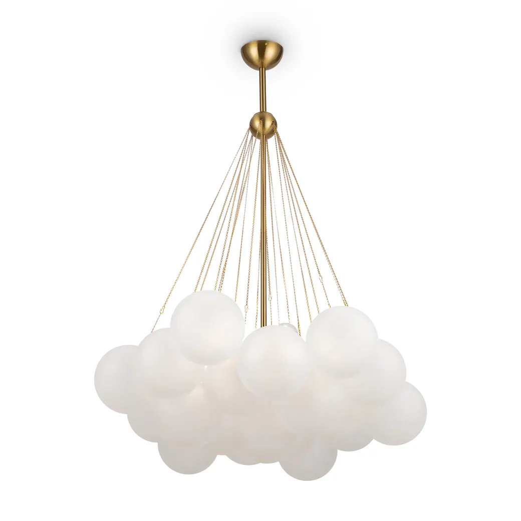 Материал арматуры — металл, цвет — хром/латунь. Подвесные светильники c цоколями E14/E27/G9. Белые стеклянные плафоны с рисунком в виде космических планет крепятся на тонких тросах, которые регулируются по высоте, создавая эффект парящих облаков.