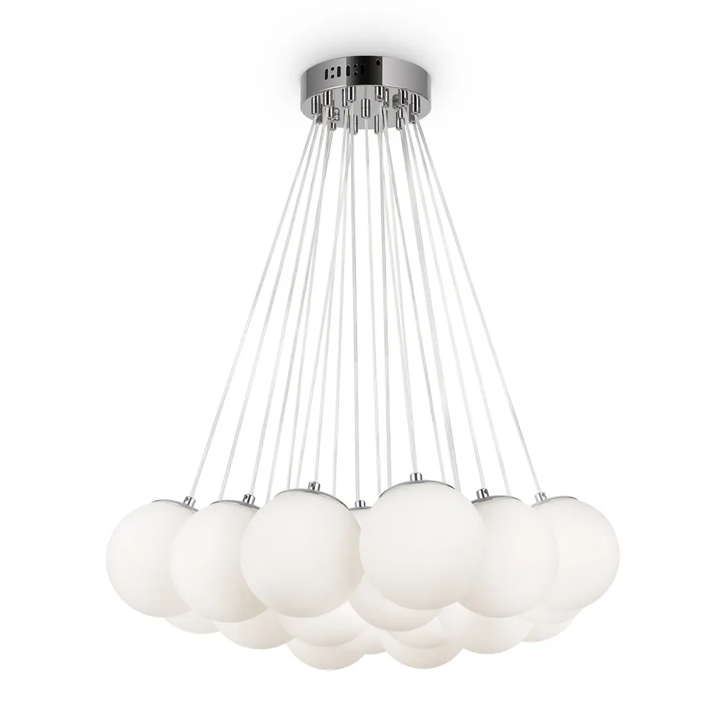 Материал арматуры — металл, цвет — хром/латунь. Подвесные светильники c цоколями E14/E27/G9. Белые стеклянные плафоны с рисунком в виде космических планет крепятся на тонких тросах, которые регулируются по высоте, создавая эффект парящих облаков.