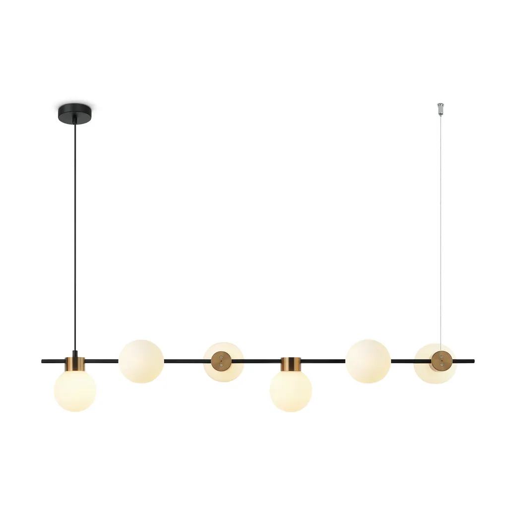 Металлическая арматура, цвет - черный + латунь. Стеклянные плафоны в двух оттенках - матовый белый или дымчатый. Направление плафонов в разные стороны позволяет распределить свет максимально равномерно. Источник светал - лампы с цоколем G9.