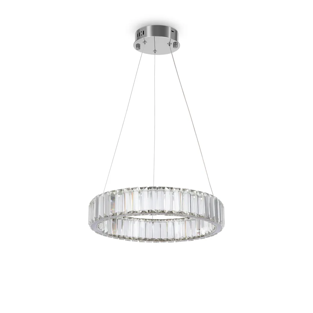Металлическая арматура в цвете латунь и хром. Хрустальные декоративные кольца с геометричными гранями. LED-источник света. Регулировка цветовой температуры (3000-4000-5000K) и яркости 4G-dimming при помощи пульта (в комплекте).