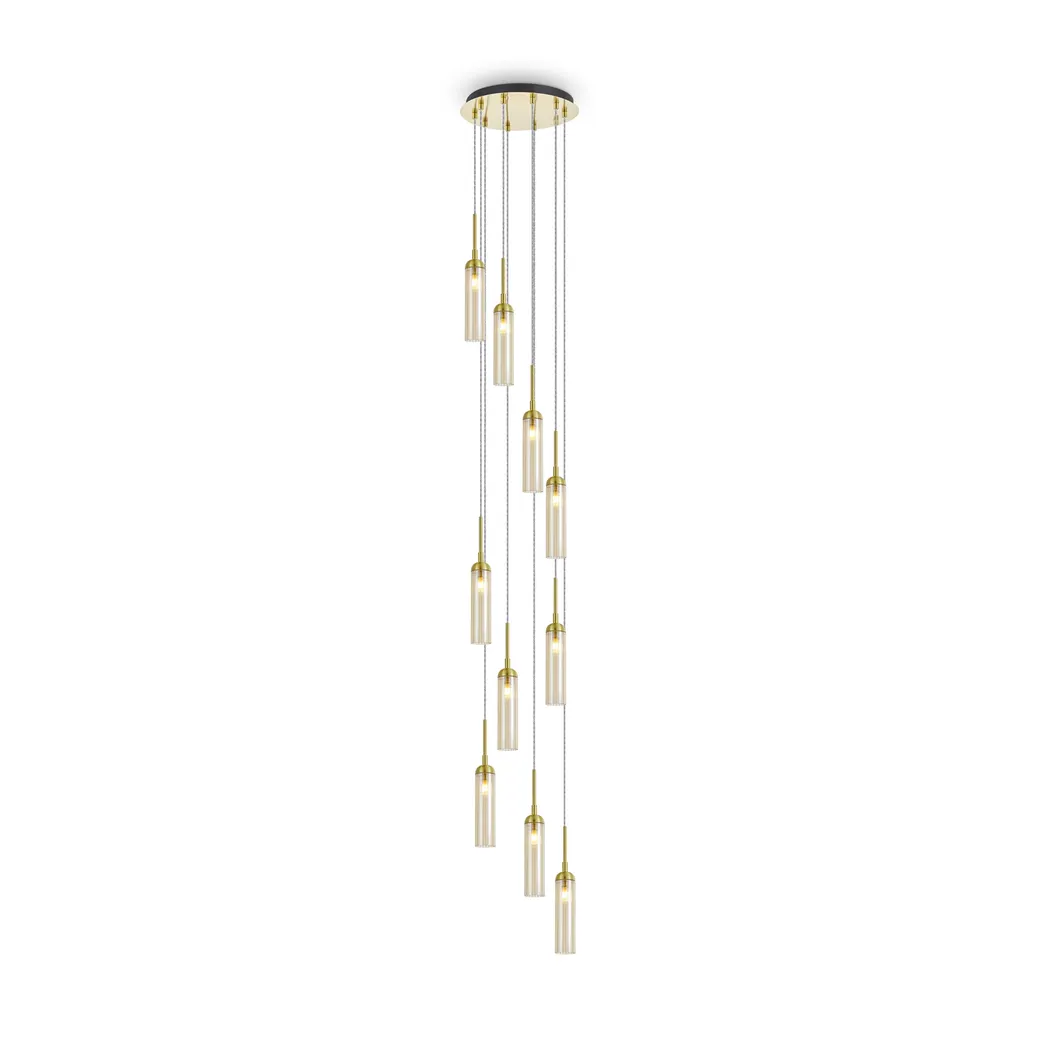 Арматура из металла, цвет — золото. Рельефные плафоны в тренде ZIGZAG. Материал — стекло, цвет — янтарный. Высота подвесных светильников регулируется. Плафоны закреплены на металлическую сферу. Источник света — лампа с цоколем G9.