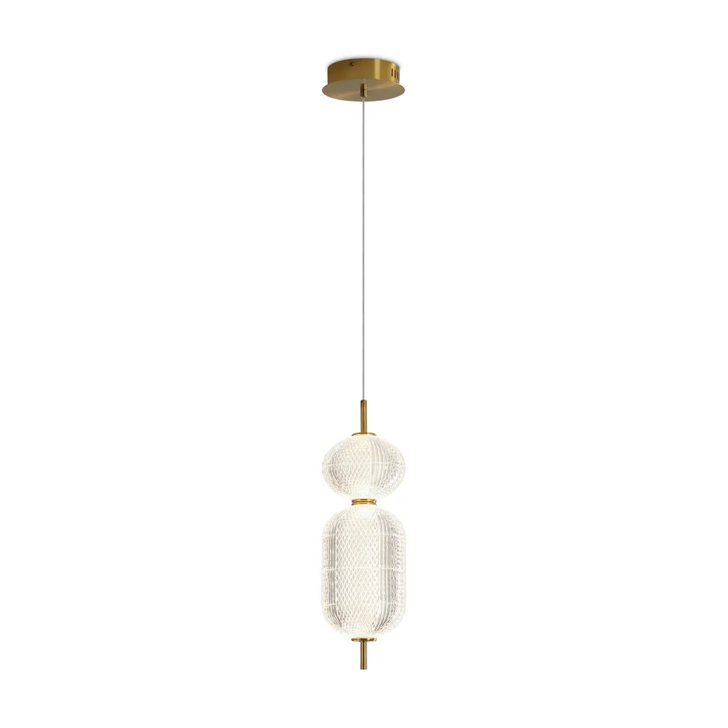 Арматура выполнена из металла в цвете латунь. Прозрачные плафоны. Вертикальные и горизонтальные подвесные светильники разных размеров. LED источник света. Цветовая температура 3000К.