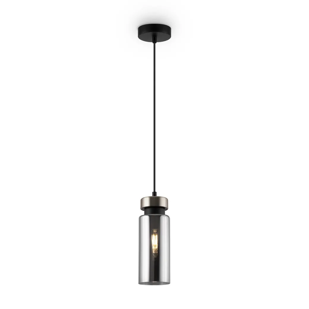 Металлическая арматура в двух оттенках: никель и черный с золотом. Плафон – глянцевое стекло. Цвет – серый. Оригинальная вытянутая цилиндрическая форма для акцентной подсветки. Источник света – лампа с цоколем E14.