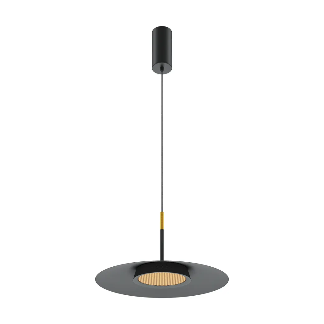 Металлический корпус, цветовая палитра - черный, белый, золото и терракотовый. Два вида плафонов: «таблетка» с графичным рельефом из ассиметричных линий; «таблетка» + идеально-гладкая металлическая «тарелка». Дизайн вдохновлен супрематической эстетикой. LED-источник света, цветовая температура - 3000К. Регулируемый провод - 3 метра.