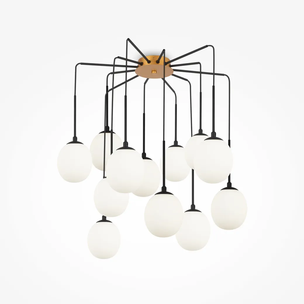 Металлическое основание, цвет - золото. Черная матовая арматура. Регулируемая высота плафонов за счет изменения длины проводов. Овальные плафоны из белого матового стекла с резьбой для удобной самостоятельной замены ламп. Цоколь G9. Лампы в комплект не входят.