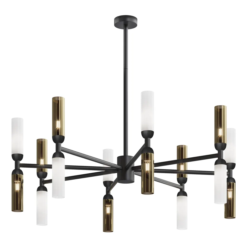 Металлическая арматура, цвет - черный. Светильники стилизованы под форму песочных часов с обтекаемой формой. Керамические элементы с глянцеовй глазурью. Подвесные светильники с плафонами из белой керамики с прозрачным, черно-белым, золото-белым и белым стеклом. Регулируемая высота подвесных светильников.
