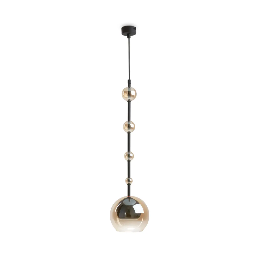 Арматура - металл, плафоны - стекло. Цветовый комбинации арматуры и плафона: черный + прозрачный, черный + янтарный, латунь + прозрачный. Элементы декора - выдувные "бусины" из стекла. Высота проводов регулируется. Источник света - лампа с цоколем GU10.