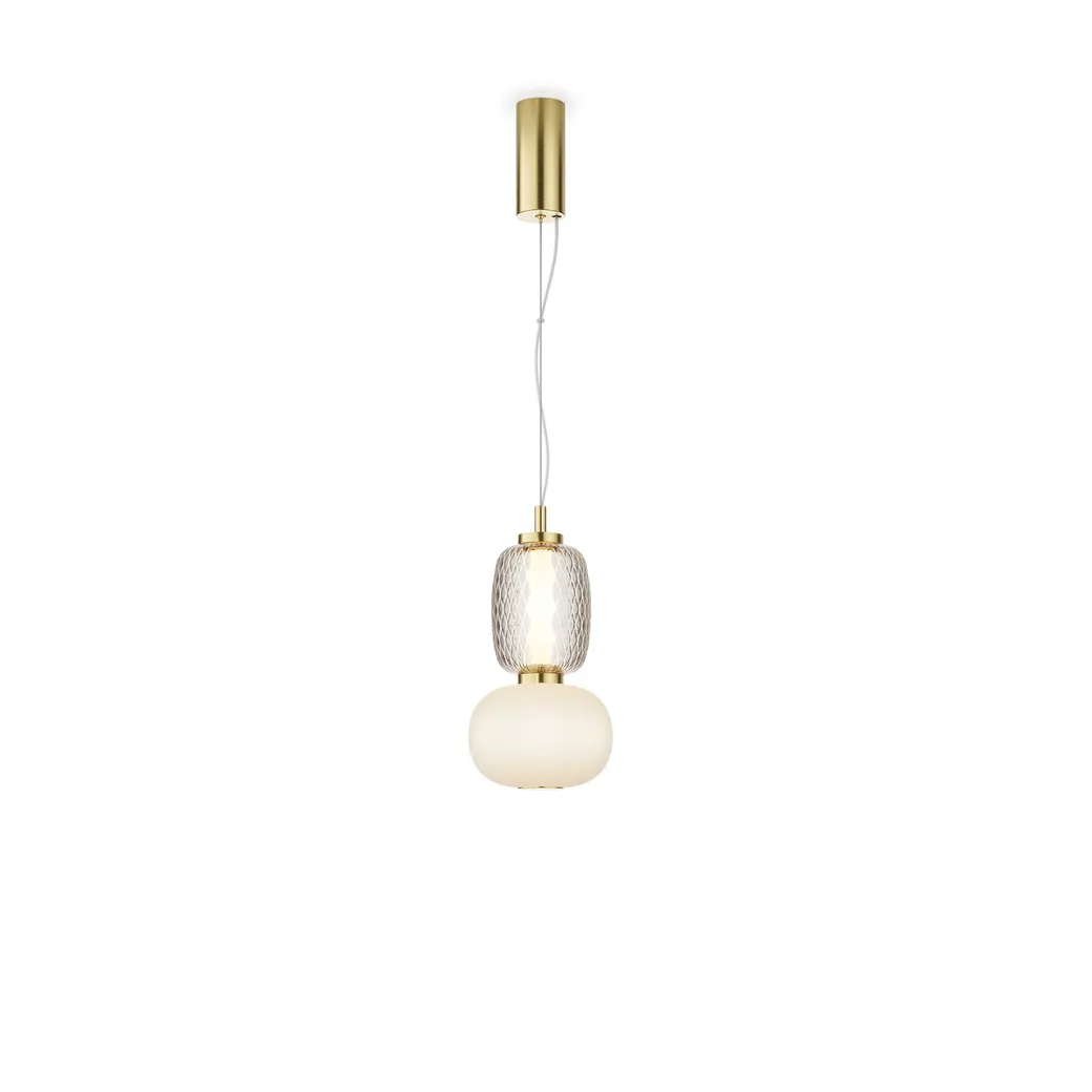 Металлическая арматура, цвет - золото, хром. Микс плафонов округлых и вытянутых форм из белого матового и прозрачного стекла с сетчатым и с линейным повторяющимся рельефным рисунком. Регулируемая высота подвесных моделей, провод - 3 метра. LED-источник света, цветовая температура 3000К.