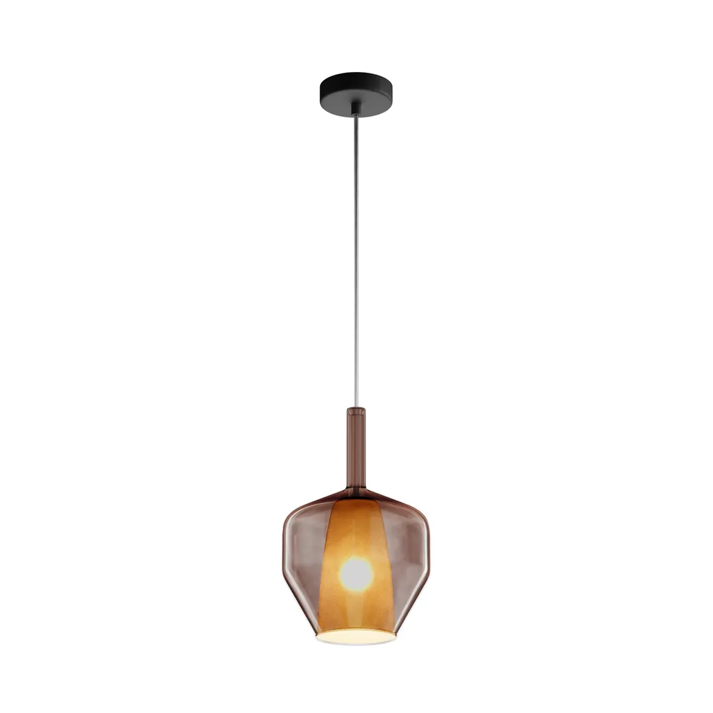 Металлическое основание, цвет — черный. Двойные стеклянные плафоны. Многообразные геометрические формы плафонов. Цвет стекла: зеркальный золотой, кофейный и дымчатый, а также градиентный белый. Регулируемая длина провода — 3 метра. Источник света — лампа с цоколем Е27.