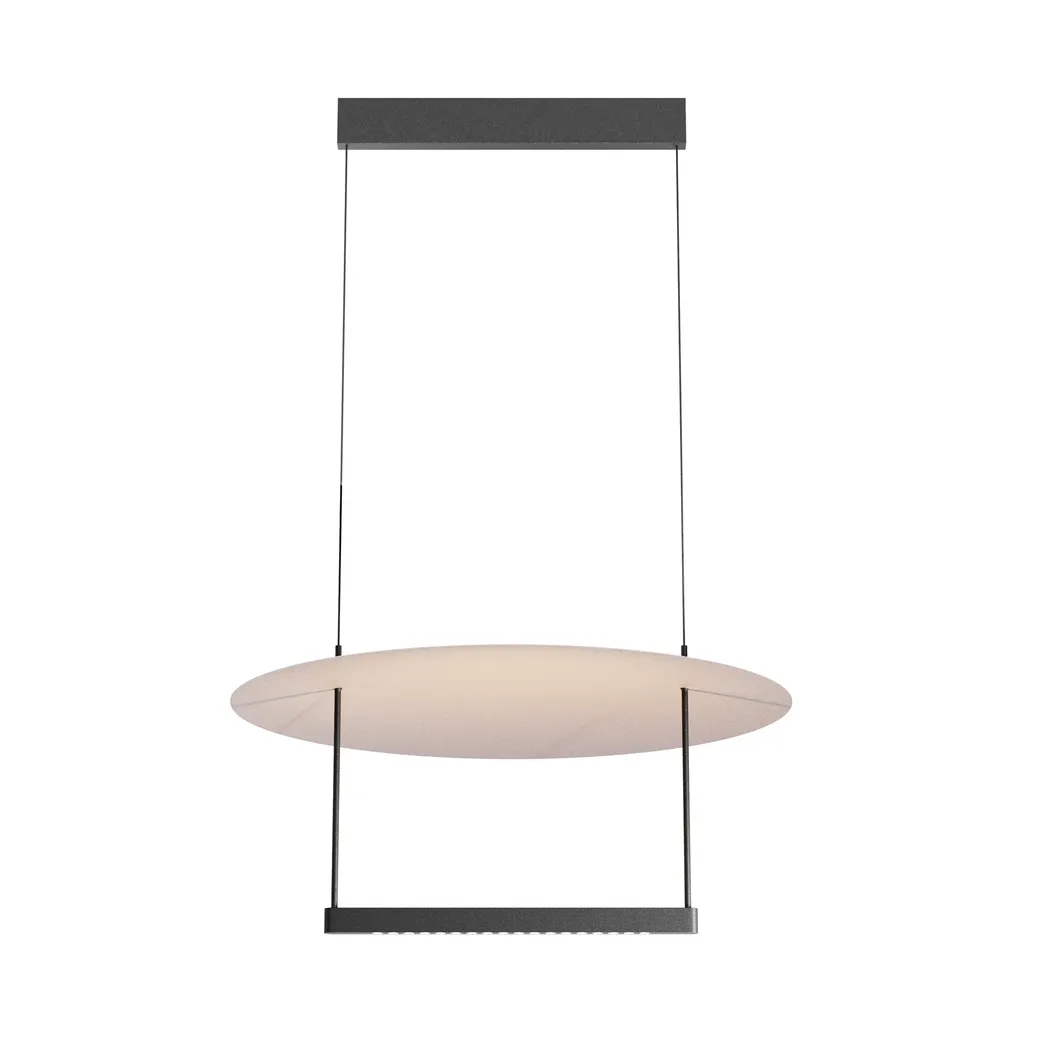 Арматура из алюминия черного цвета, контрастирует белой пластиной диаметром 420мм или 600мм. Силиконовый рассеиватель скрывает LED-источник света с температурой 3000К. В серии представлены светильники двух поколений: в первом источник светит только вверх; во втором источник светит вверх и вниз, что позволяет подсветить рабочую поверхность. Также светильники второго поколения дополнительно имеют функцию диммирования. Высота подвесных светильников регулируется, максимальная длина провода - 3 метра.