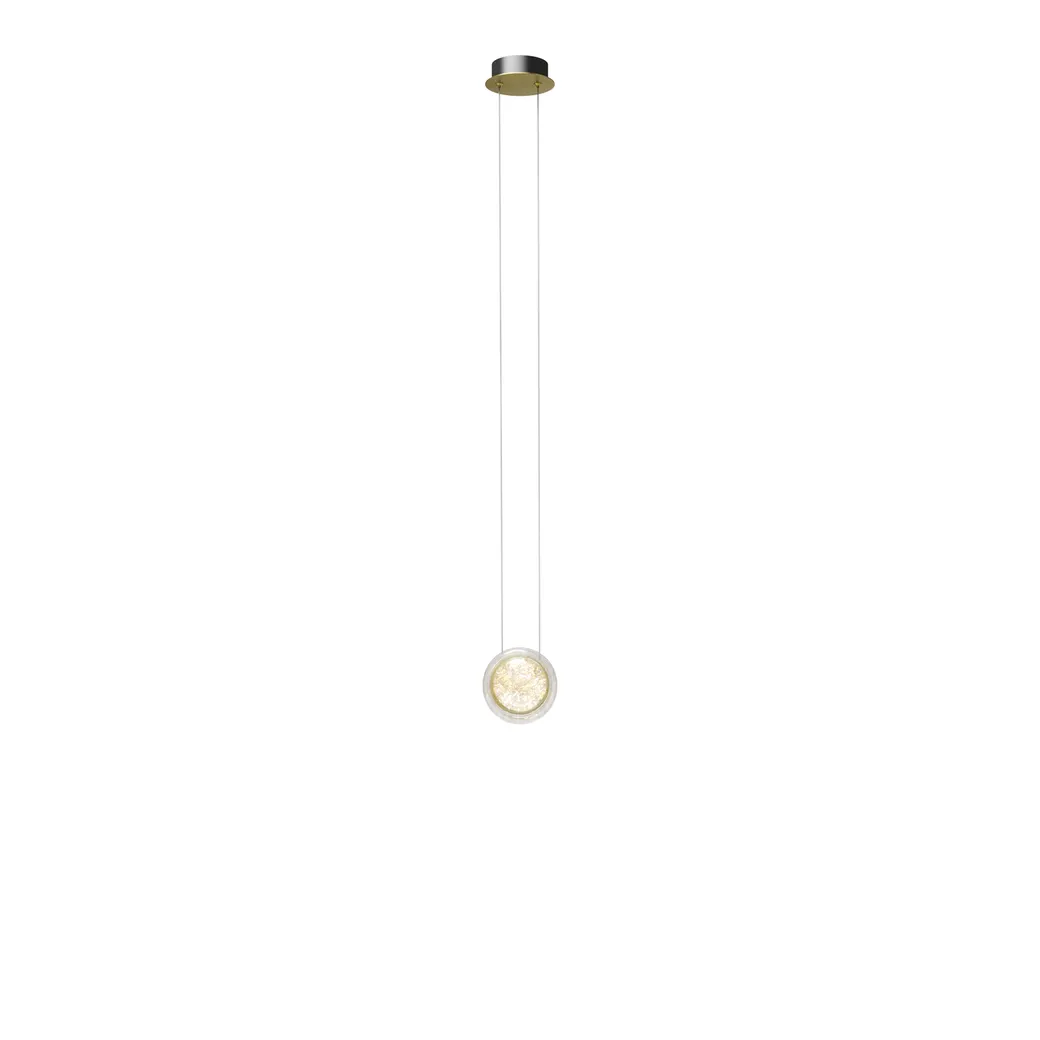 Арматура из металла цвета латунь с сатинированным финишным покрытием сочетается с прозрачными плафонами. Подвесные одинарные, горизонтальный и каскадные светильники оснащаются LED-модулем с двумя плоскими плафонами из акрила со сложным, актуальным паттерном на поверхности. Цветовая температура — 3000К, угол рассеивания — 125 градусов.