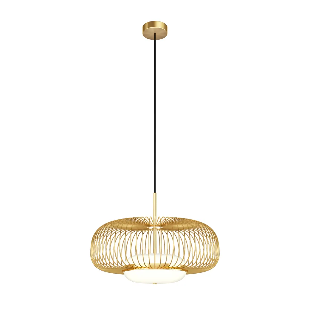 Цвет арматуры — латунь. Материал арматуры — металл. Абажур — каркас из проволоки, стекло. Оригинальный дизайн с эффектом левитации. Стеклянный рассеиватель со специальным выступом для крепления проволочного плафона. Два типа подвесных светильников: компактные со сменными лампами и крупный с LED-модулем для двунаправленного освещения. Провод длиной 3 метра для высоких потолков. Регулируемая высота подвеса. Универсальный дизайн для неоклассики, эклектики и фьюжн.