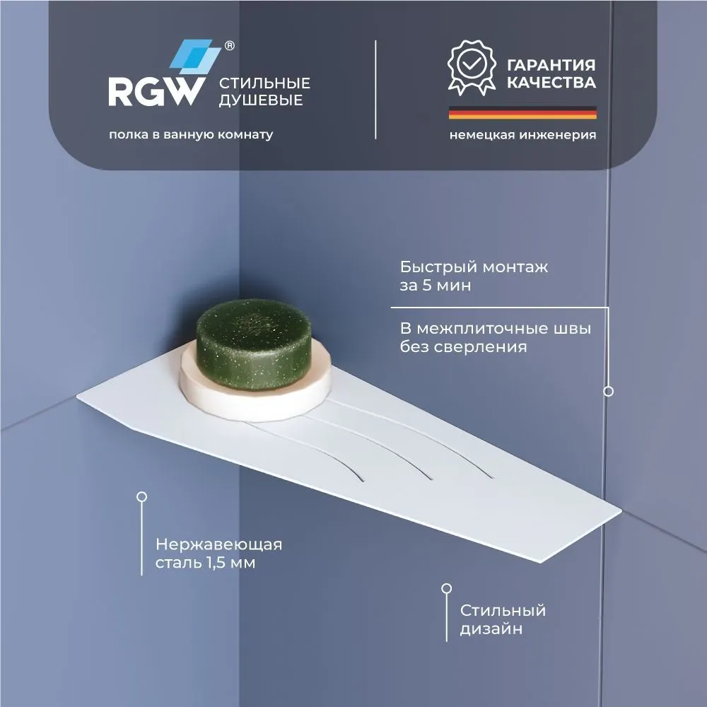 - Идеально для угловых зон: Полка разработана для установки в угловых зонах, что экономит пространство в ванной комнате.