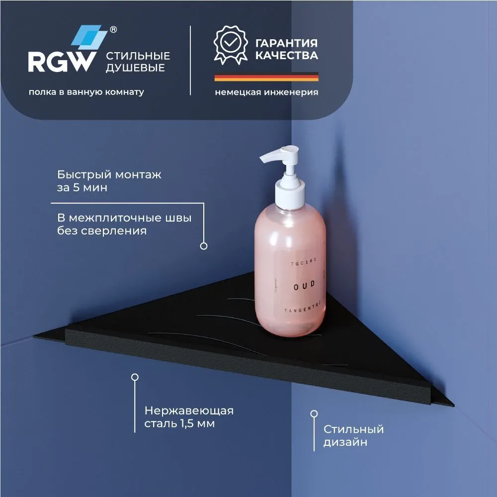 - Легкий монтаж без сверления плитки: Полка для душа RGW легко устанавливается без повреждения плитки, что делает процесс установки быстрым и удобным.
