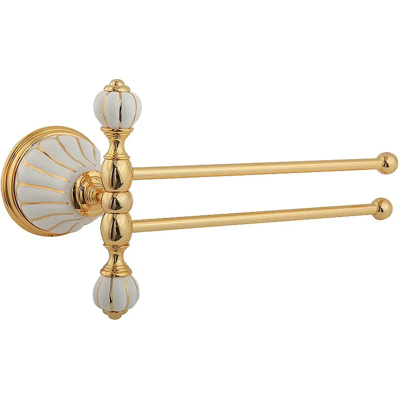 Полотенцедержатель Migliore Olivia 17528 поворотный двойной. Изделие выполнено из выполнен из латуни и имеет гальваническое покрытие золотом 24 карата, которое при правильном уходе надолго сохранит свой блеск.Характеристики: Цвет: золото, белый с декором золото. Материал: латунь, керамика. Фактура: глянцевая. Форма: округлая. Размер (ШхВхГ): 25 х 14,8 х 10 см. Диаметр розетки: 7,6 см. Метод крепления: шурупы. Монтаж: настенный. В комплекте поставки: Полотенцедержатель. Крепления (шурупы).