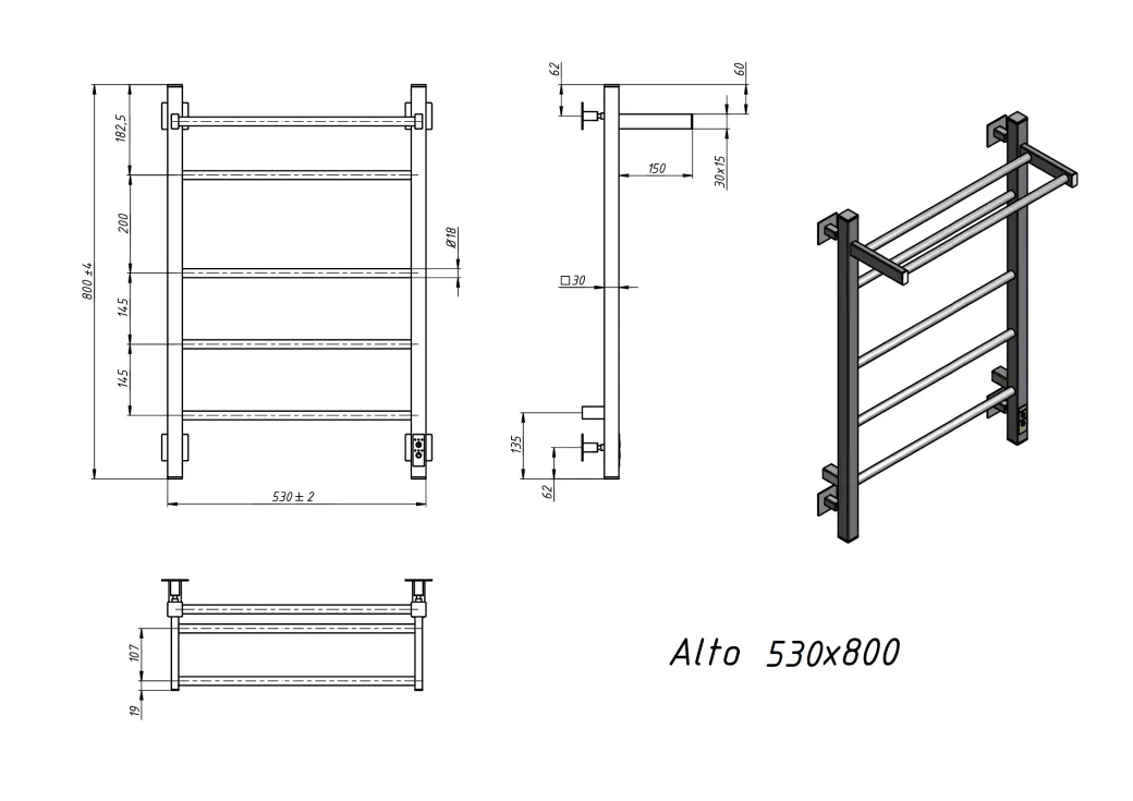 Полотенцесушитель электрический Grota Alto 530х800 белый Alto 530х800 RAL9016 EL — фото 7, Электрические полотенцесушители