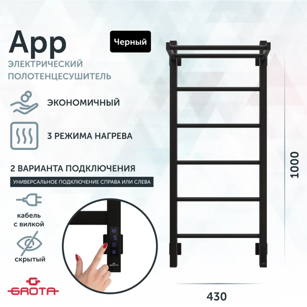 Полотенцесушитель электрический Grota App 430х1000 черный арт-App 430х1000 RAL9005 EL — фото 7, Электрические полотенцесушители