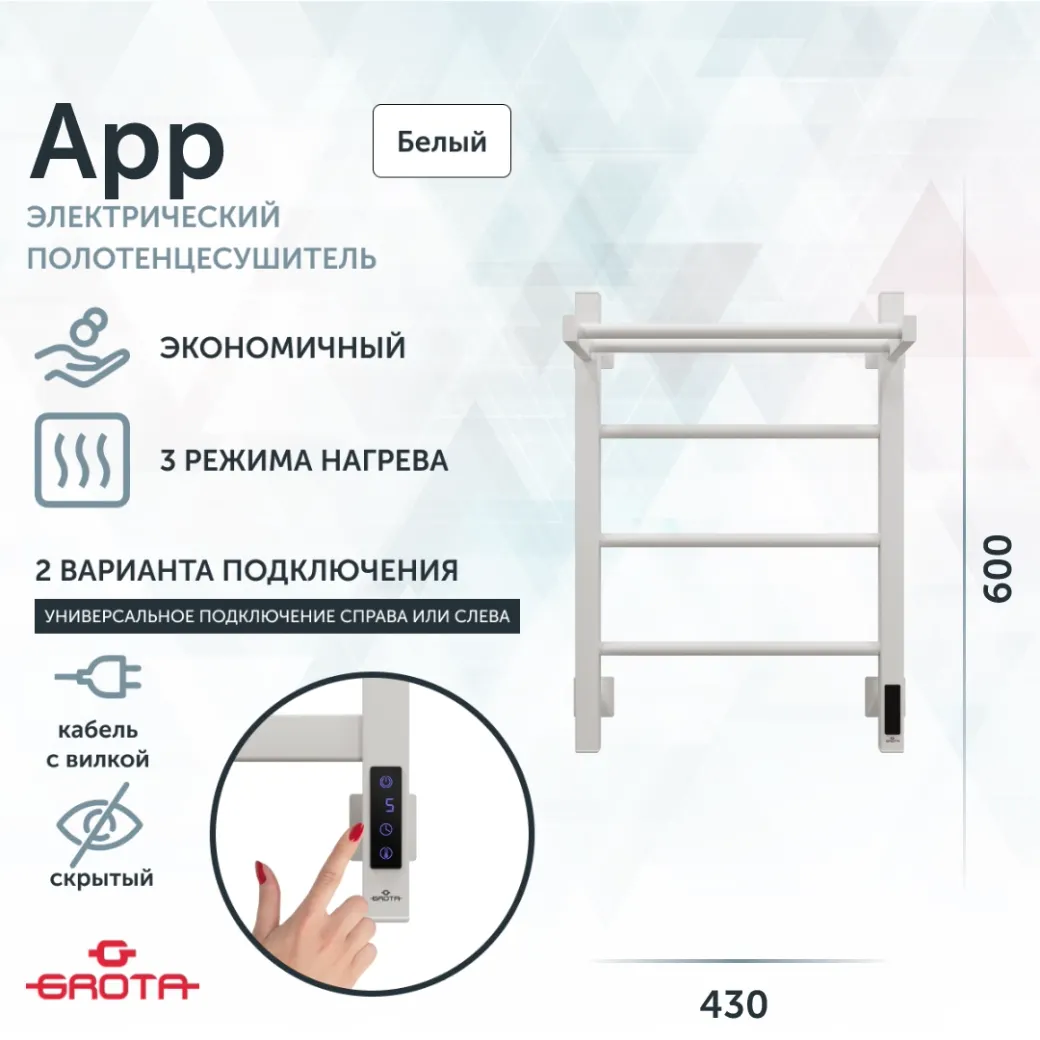 Полотенцесушитель электрический Grota App 430х600 белый арт-App 430х600 RAL9016 EL — фото 7, Электрические полотенцесушители