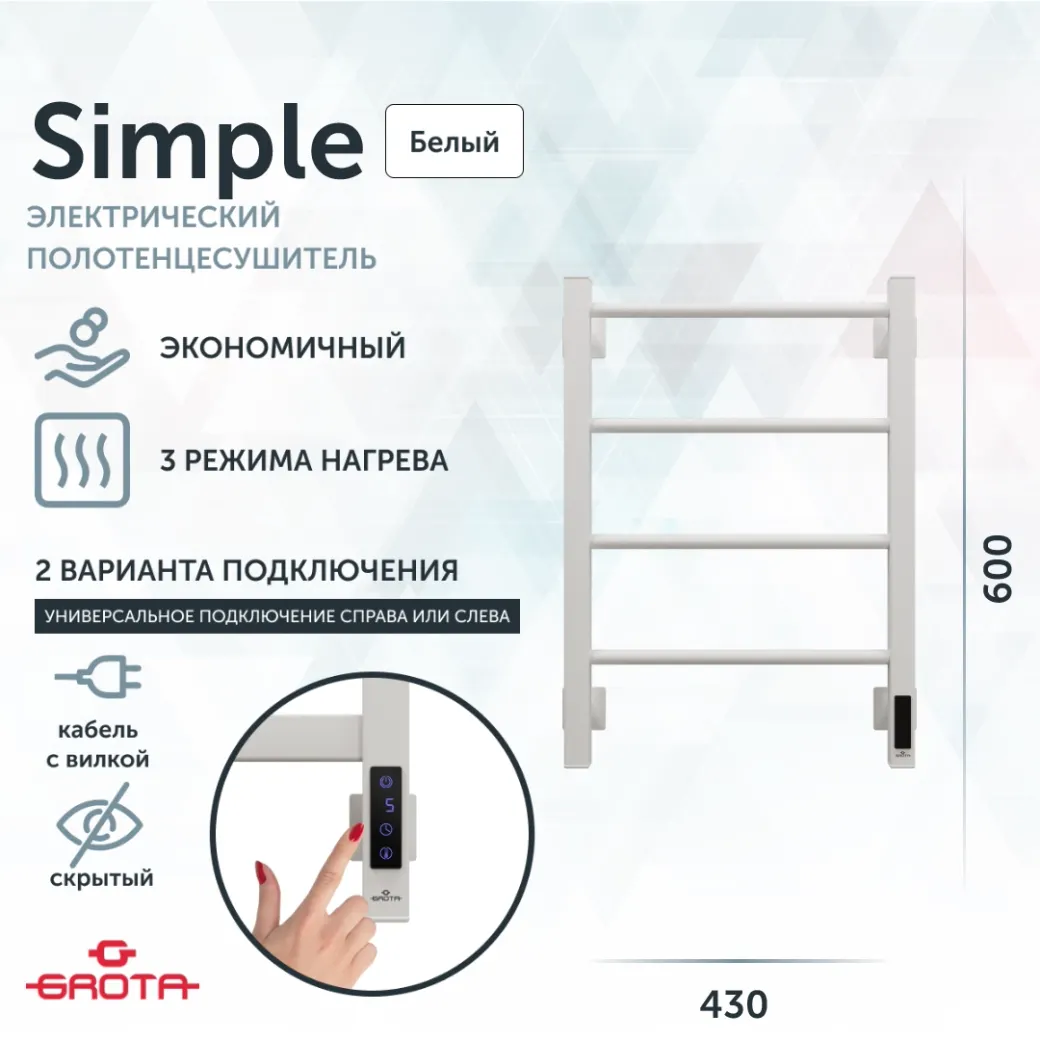 Полотенцесушители фирмы Grota - это современный дизайн, надежное качество, долгий срок службы! br Универсальное подключение к сети дают возможность подключения полотенцесушителя и слева и справа. Скрытое подключение обеспечивает эстетичный внешний вид при котором нет видимых проводов. В комплекте так же есть кабель-вилка длиной 100 см для обычного подключения через розетку.br Нагревательным элементом в электросушилке является греющий кабель аналог теплого пола, кабель заправляется внутрь каждой трубы и передает тепло на поверхность полотенцесушителя. Кнопка включения/выключения и таймер на 2 / 4 / 6 часов , который позволяет включать изделие на ограниченное время. Эта функция дает возможность значительно экономить электричество.br br ТЕХНИЧЕСКИЕ ХАРАКТЕРИСТИКИ:br