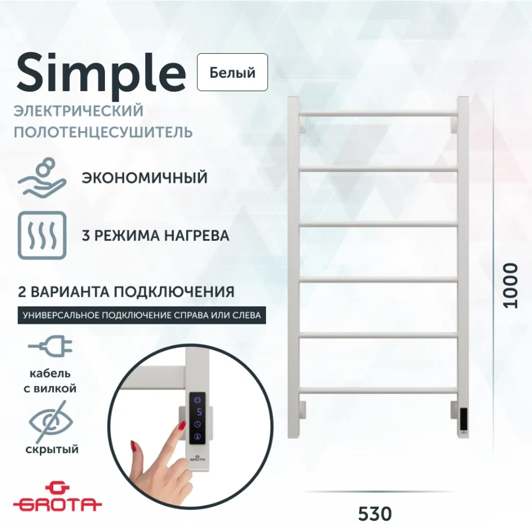Полотенцесушитель электрический Grota Simple K 530х1000 белый арт-Simple K 530х1000 RAL9016 EL — фото 6, Электрические полотенцесушители